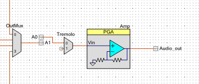The last two stages before the final output are the tremolo, which is simply a multiplexer with one input left floating, and the variable gain, which is achieved using a programmable gain amplifier.