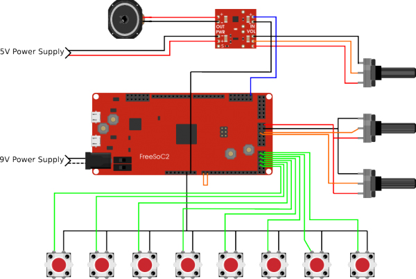 The FreeSoC2 is an excellent platform for playing with the capabilities of Cypress PSoC devices. I had never touched a PSoC before this project, so I wasn’t sure exactly what I was getting into. Turns out, they’re a pleasure to work with. Whenever I get a chance to play with a new technology, I like to build a simple musical instrument. Why? Because even the most basic keyboard synthesizer incorporates important concepts like pushbutton input and output, signal generation, signal switching and timing. Building this keyboard gave me a pretty good window into the FreeSoC2 and helped me get a hang of using the PSoC Creator software.
