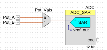 To read the potentiometers, we’ll need to set up an ADC. If you’re familiar with the ADC on the Arduino, the SAR on the FreeSoC is very similar. There aren’t enough separate ADCs to set up one for each analog input, which would be a waste of resources anyway, so we need to multiplex the input. The component labeled Pot_Vals is a 2-channel analog multiplexer that allows us to connect either of the two potentiometers to the ADC. To get a reading from a specific potentiometer, the first thing we need to do is call Pot_Vals_Select() to connect the right pin to the ADC. Then we start the ADC conversion and finally retrieve the ADC result.