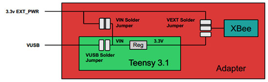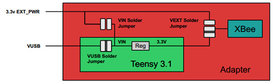 In this case, switch the TNSY-EXT jumper to ‘EXT’, short the VIN-EXT_PWR jumper, and cut the trace between the Teensy’s USB PWR jumper. Now both the Teensy and XBee are powered from the ext power pins, so you’ll need to provide power and plug in the USB if you want to reprogramming the device.