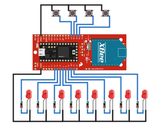 The trickest serial link in this project is the one that goes from the Teensy to the XBee because we have little information about it. Without expensive scopes, use the Din and Dout LEDs to monitor if there is activity from the Teensy to the XBee. One illumniates when the Teensy sends data to the XBee, and the other for showing when data is comming from the XBee to the Teensy.