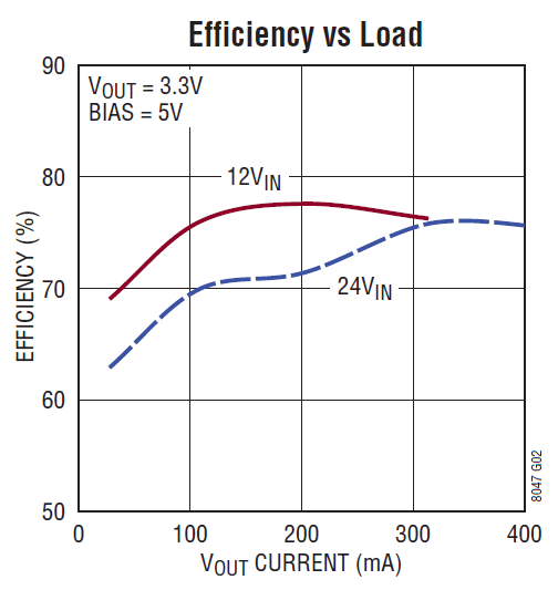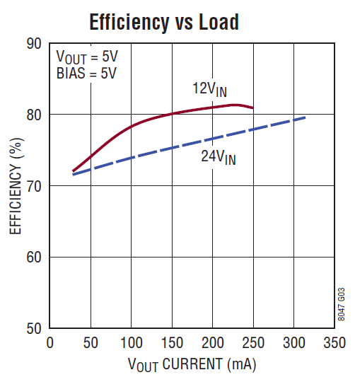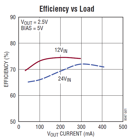 >83%, 12V in, 12V @ 100 ~ 170 mA >80%, 24V in, 8V @ 180 ~ 330 mA >75%, 24V in, 5V @ 100 ~ 329 mA >75%, 24V in, 12V @ 100 ~ 230 mA >75%, 12V in, 3.3V @ 100 ~ 310 mA >73%, 12V in, 5V @ 50 ~ 260 mA >73%, 12V in, 2.5V @ 100 ~ 295 mA >71%, 24V in, 3.3V @ 125 ~ 400 mA >71%, 24V in, 2.5V @ 240 ~ 405 mA |