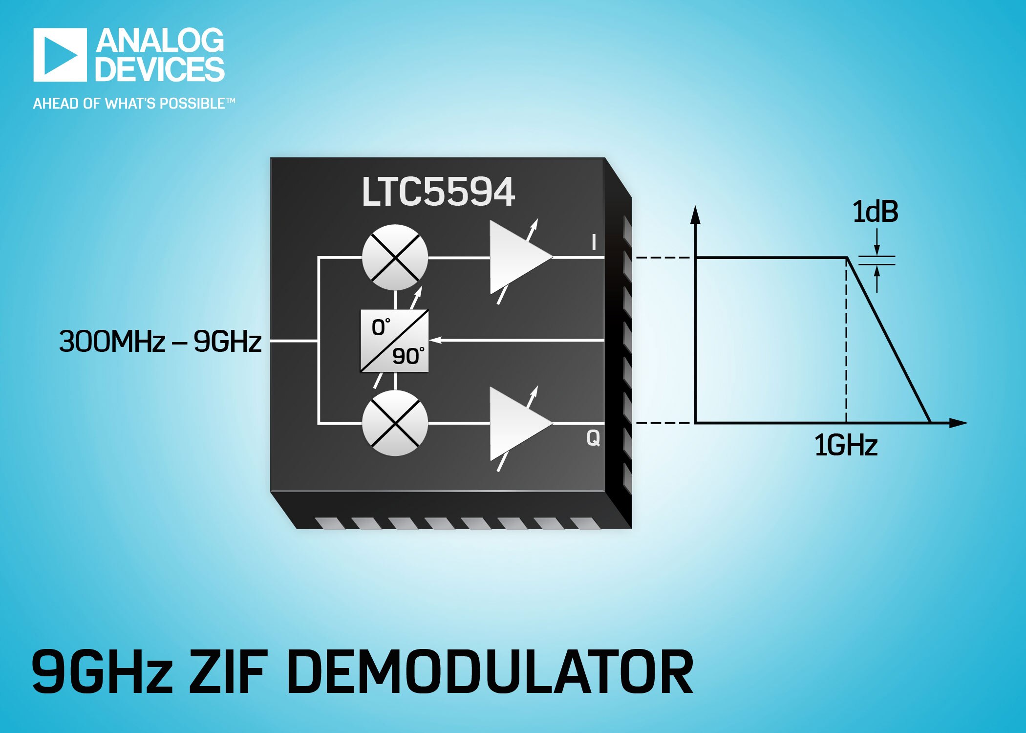 Analog Devices' LTC5594 is a direct conversion quadrature demodulator optimized for high linearity zero-IF and low-IF receiver applications in the 300 MHz to 9 GHz frequency range. The outstanding dynamic range of the LTC5594 makes the device suitable for demanding infrastructure direct conversion applications. Proprietary technology inside the LTC5594 provides the capability to optimize OIP2 to 65 dBm, and achieve image rejection better than 60 dB. The DC offset control function allows nulling of the DC offset at the A/D converter input, thereby optimizing the dynamic range of true zero-IF receivers that use DC-coupled IF signal paths. The wideband RF and LO input ports make it possible to cover all the major wireless infrastructure frequency bands using a single device. The IF outputs of the LTC5594 are designed to interface directly with most common A/D converter input interfaces. The high OIP3 and high conversion gain of the device eliminate the need for additional amplifiers in the IF signal path. The very wide IF bandwidth of more than 1GHz makes the LTC5594 particularly suited for demodulation of very wideband signals, especially in 5 G front-haul/back-haul receiver applications.