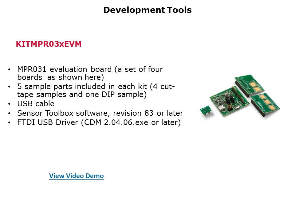 The development kit KITMPR03xEVM is also available. It includes a set of four boards, five sample parts, a USB cable, and the software necessary to run the demonstration. A step-by-step setup and operation video is also available here.